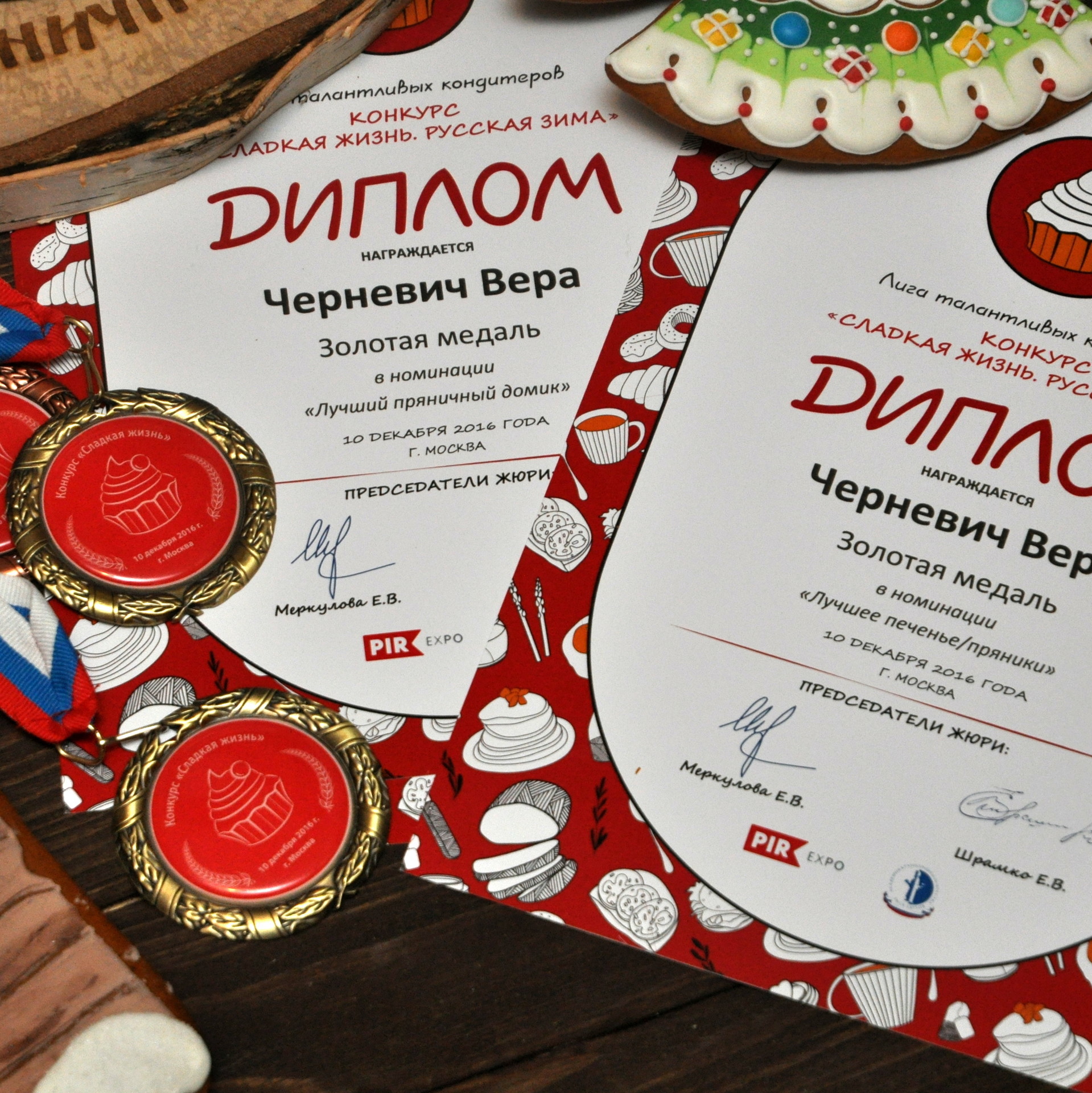 - В декабре 2016 года мы получили две золотые медали на кондитерском конкурсе “Сладкая жизнь” за объёмные композиции и плоские пряники